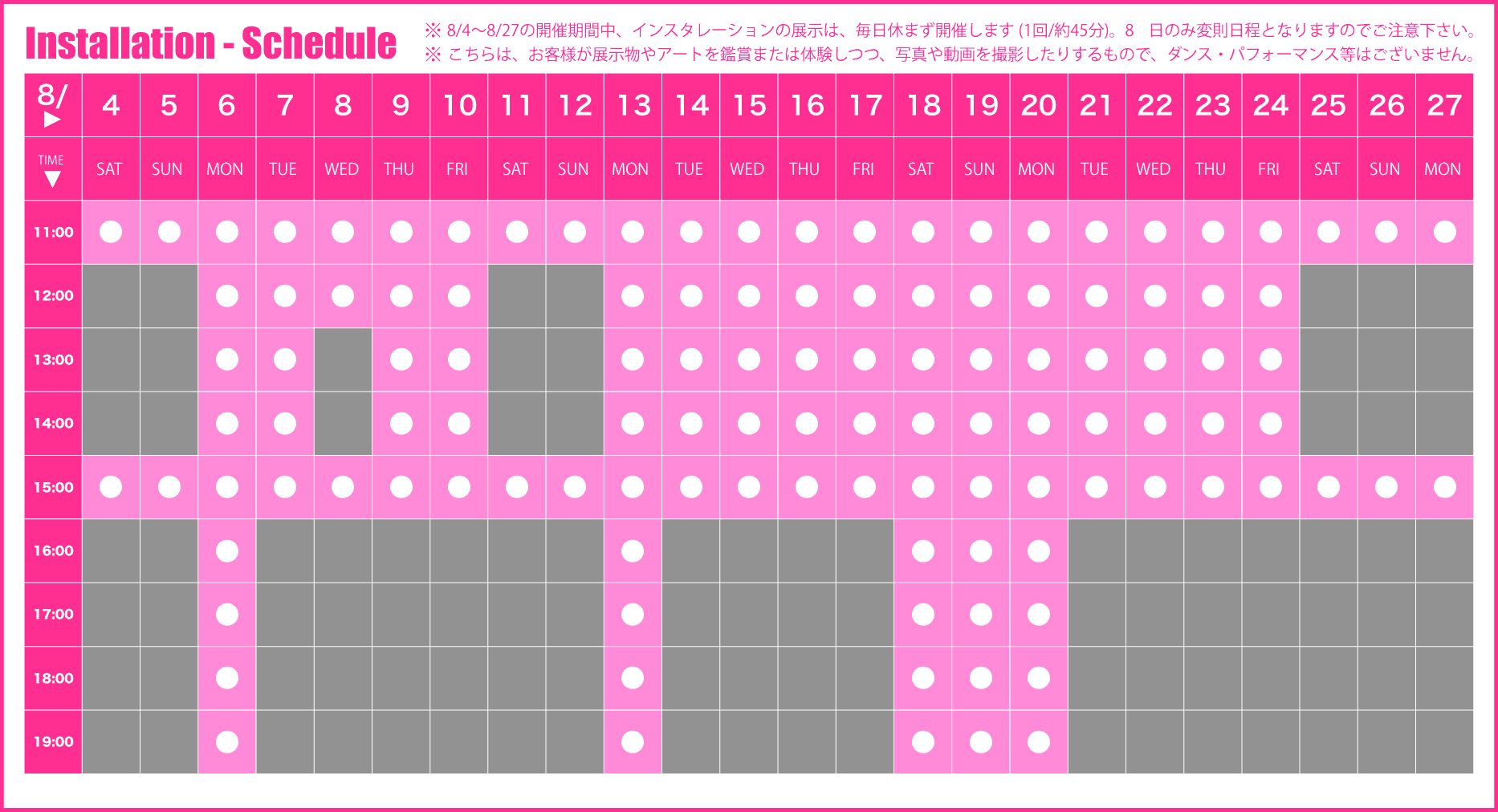 - ※ スケジュールは、予告なく変更する場合がございます。あらかじめ、ご了承下さいませ。